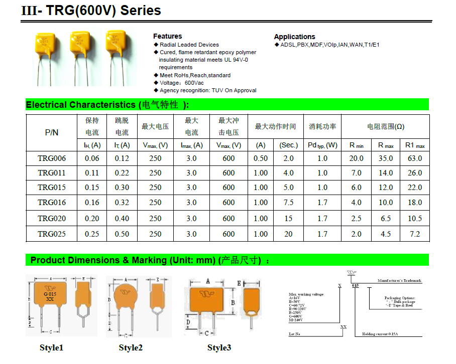 dispositivos de plomo radial, polímero epoxi curado, retardante de llama, material aislante cumple con los requisitos ul 94v-0, cumplir rohs, alcance, estándar, voltaje: 600vac, reconocimiento de la agencia: aprobación tuv, además, este producto ha pasado el UL certificación, que es un producto en más usos. y tiene una ventaja en precio. puede reducir la soldadura manual. la corporación tiene más voltaje productos. por favor envíenos un correo electrónico si tiene algún problema.